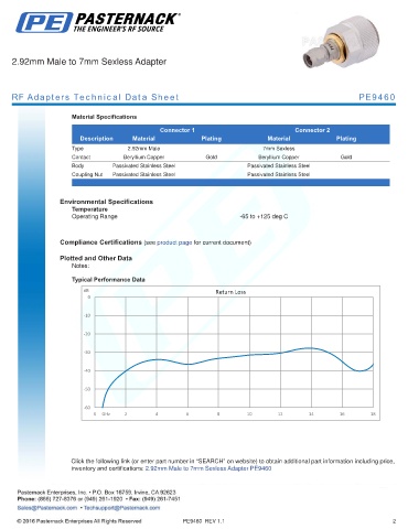 inventory and certifications: 2.92mm Male to 7mm Sexless Adapter PE9460