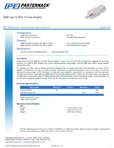 inventory and certifications: SMB Jack to BNC Female Adapter PE9136