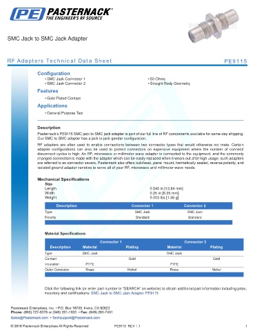 Pasternack’s PE9115 SMC jack to SMC jack adapter is part of our full line of RF components available for same-day shipping.