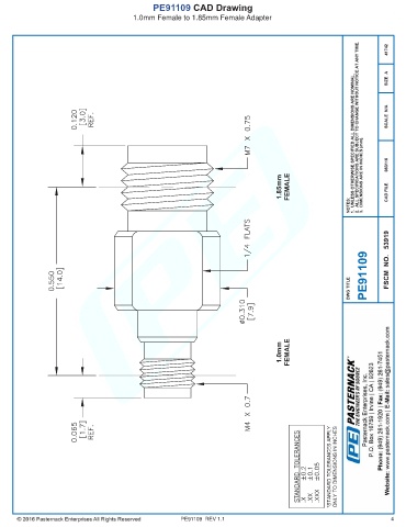 PE91109 CAD Drawing 1.0mm Female to 1.85mm Female Adapter PE91109 REV 1.1 4