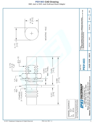 PE91403 CAD Drawing SMC Jack to SMC Jack Bulkhead Mount Adapter PE91403 REV 1.0 4