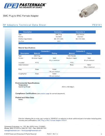 inventory and certifications: SMC Plug to BNC Female Adapter PE9141