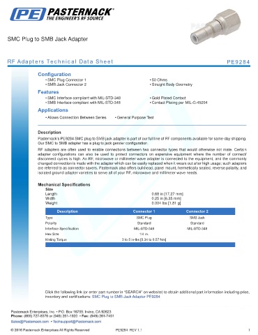 inventory and certifications: SMC Plug to SMB Jack Adapter PE9284