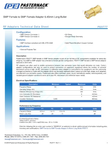 inventory and certifications: SMP Female to SMP Female Adapter 6.45mm Long Bullet PE9777
