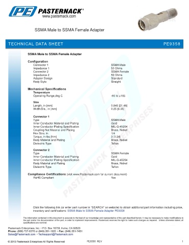 inventory and certifications: SSMA Male to SSMA Female Adapter PE9358