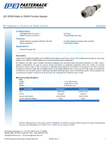 inventory and certifications: QD SSMA Male to SSMA Female Adapter PE9685