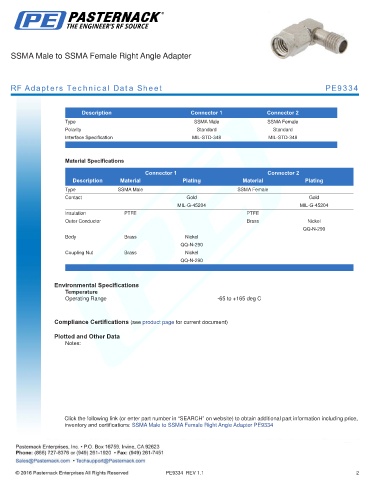 inventory and certifications: SSMA Male to SSMA Female Right Angle Adapter PE9334