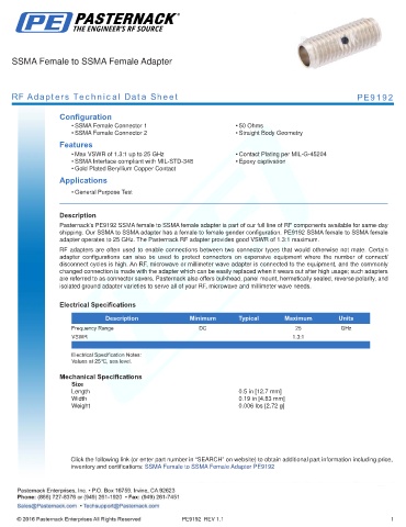 inventory and certifications: SSMA Female to SSMA Female Adapter PE9192