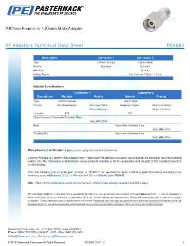 inventory and certifications: 2.92mm Female to 1.85mm Male Adapter PE9665