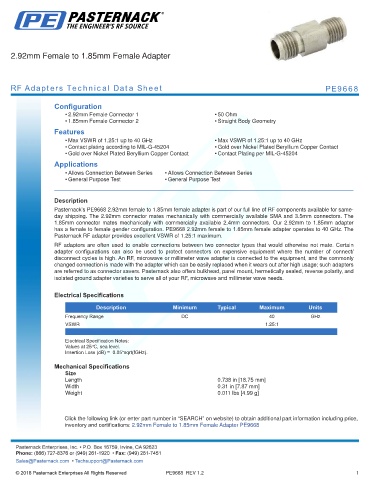 inventory and certifications: 2.92mm Female to 1.85mm Female Adapter PE9668