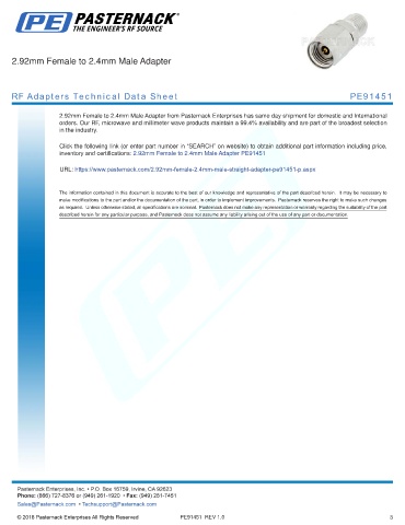 any representation or warranty regarding the suitability of the part described herein for any particular purpose, and Pasternack does not assume any liability arising out of the use of any part or documentation.