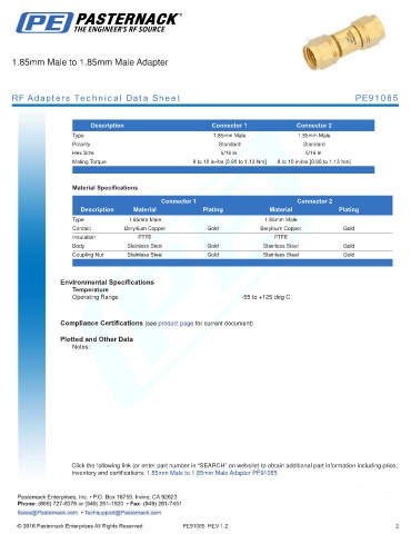 inventory and certifications: 1.85mm Male to 1.85mm Male Adapter PE91085