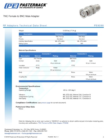 inventory and certifications: TNC Female to BNC Male Adapter PE9098
