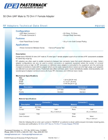 Pasternack’s PE9165 50 ohm UHF male to 75 ohm type F female adapter is part of our full line of RF components available