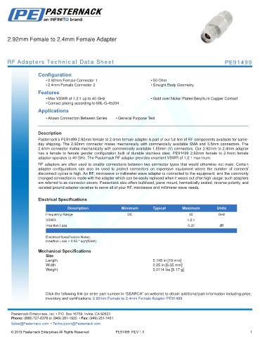 inventory and certifications: 2.92mm Female to 2.4mm Female Adapter PE91499