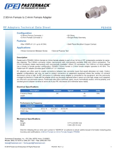 inventory and certifications: 2.92mm Female to 2.4mm Female Adapter PE9456