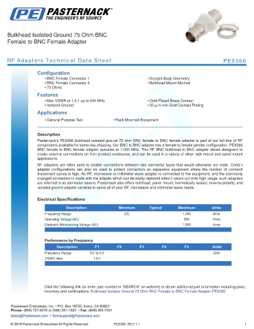 Pasternack’s PE9366 bulkhead isolated ground 75 ohm BNC female to BNC female adapter is part of our full line of RF