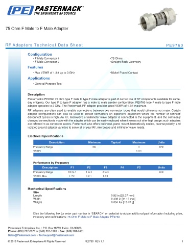 inventory and certifications: 75 Ohm F Male to F Male Adapter PE9760