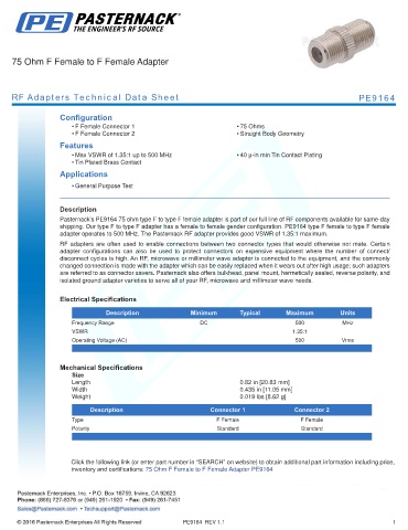 inventory and certifications: 75 Ohm F Female to F Female Adapter PE9164