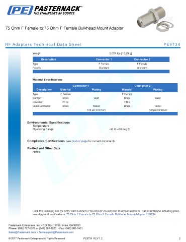 inventory and certifications: 75 Ohm F Female to 75 Ohm F Female Bulkhead Mount Adapter PE9734
