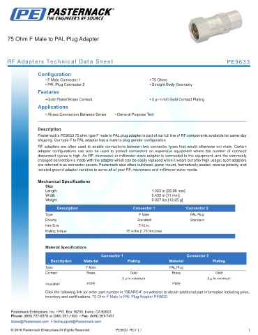inventory and certifications: 75 Ohm F Male to PAL Plug Adapter PE9633