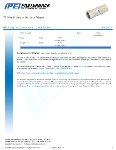inventory and certifications: 75 Ohm F Male to PAL Jack Adapter PE9632
