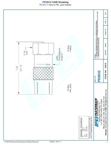 PE9632 CAD Drawing 75 Ohm F Male to PAL Jack Adapter PE9632 REV 1.1 3