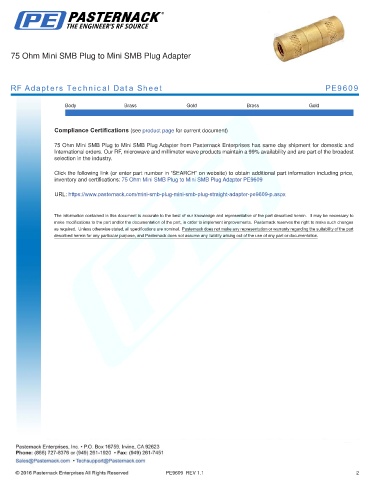 inventory and certifications: 75 Ohm Mini SMB Plug to Mini SMB Plug Adapter PE9609