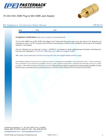 inventory and certifications: 75 Ohm Mini SMB Plug to Mini SMB Jack Adapter PE9610