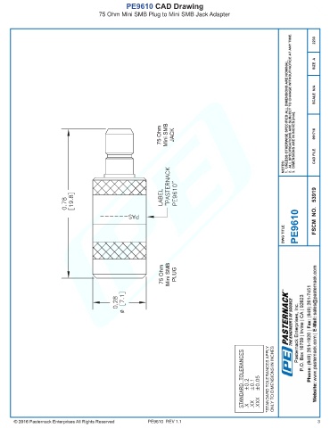 PE9610 CAD Drawing 75 Ohm Mini SMB Plug to Mini SMB Jack Adapter PE9610 REV 1.1 3