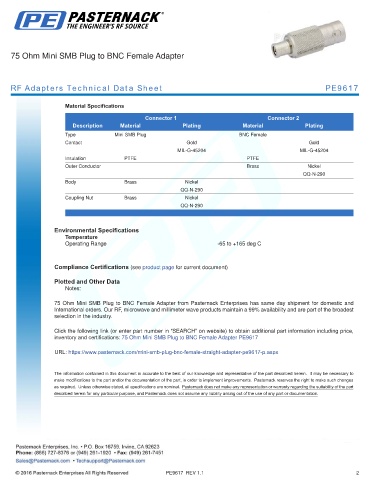 inventory and certifications: 75 Ohm Mini SMB Plug to BNC Female Adapter PE9617