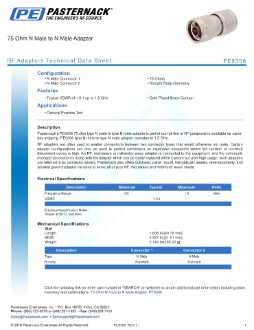 inventory and certifications: 75 Ohm N Male to N Male Adapter PE9308