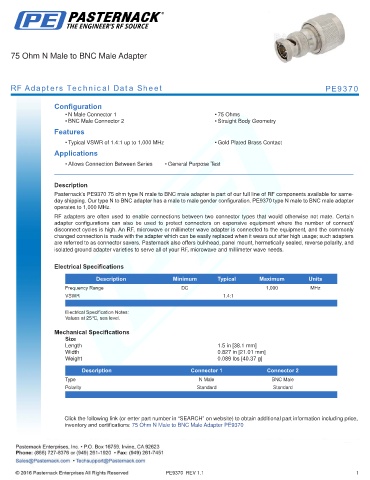 Pasternack’s PE9370 75 ohm type N male to BNC male adapter is part of our full line of RF components available for same-