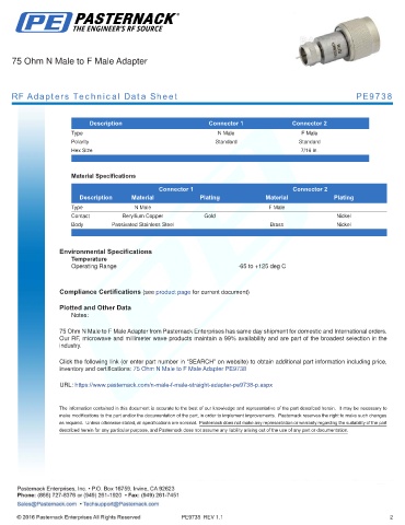 inventory and certifications: 75 Ohm N Male to F Male Adapter PE9738