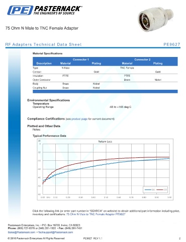 inventory and certifications: 75 Ohm N Male to TNC Female Adapter PE9627