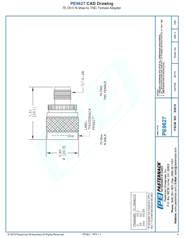 PE9627 CAD Drawing 75 Ohm N Male to TNC Female Adapter PE9627 REV 1.1 4