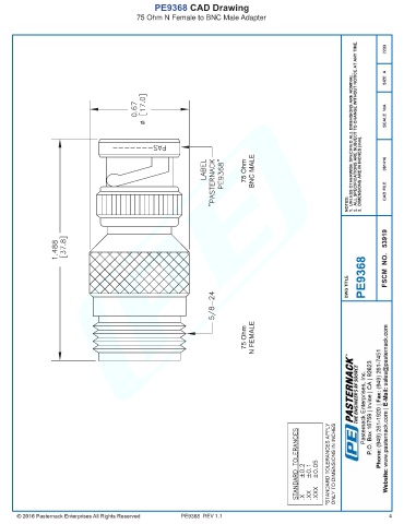 PE9368 CAD Drawing 75 Ohm N Female to BNC Male Adapter PE9368 REV 1.1 4