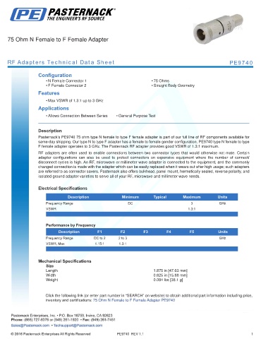 inventory and certifications: 75 Ohm N Female to F Female Adapter PE9740