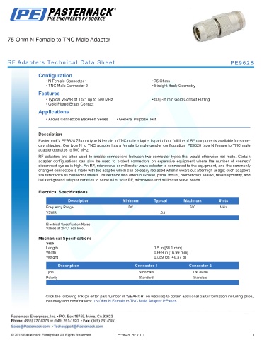 inventory and certifications: 75 Ohm N Female to TNC Male Adapter PE9628