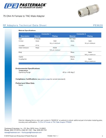 inventory and certifications: 75 Ohm N Female to TNC Male Adapter PE9628