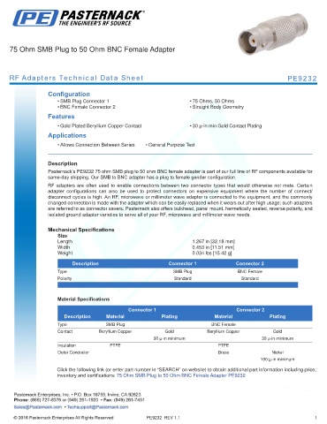 inventory and certifications: 75 Ohm SMB Plug to 50 Ohm BNC Female Adapter PE9232
