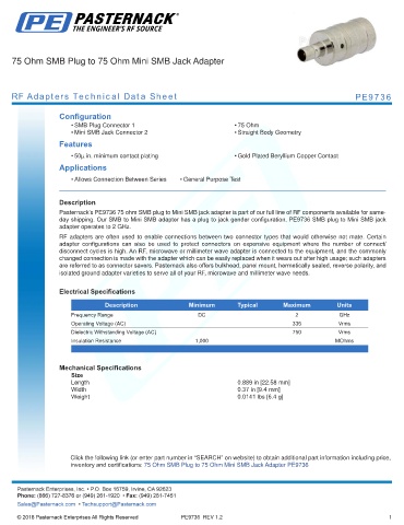inventory and certifications: 75 Ohm SMB Plug to 75 Ohm Mini SMB Jack Adapter PE9736