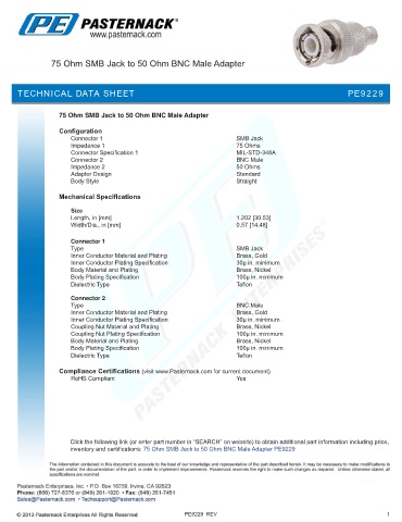 inventory and certifications: 75 Ohm SMB Jack to 50 Ohm BNC Male Adapter PE9229