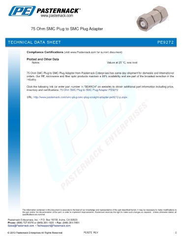 inventory and certifications: 75 Ohm SMC Plug to SMC Plug Adapter PE9272