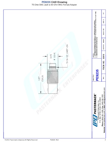 PE9235 CAD Drawing 75 Ohm SMC Jack to 50 Ohm BNC Female Adapter © 2012 Pasternack Enterprises All Rights Reserved PE9235 REV 2