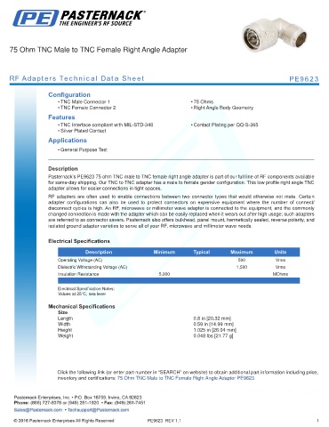 inventory and certifications: 75 Ohm TNC Male to TNC Female Right Angle Adapter PE9623