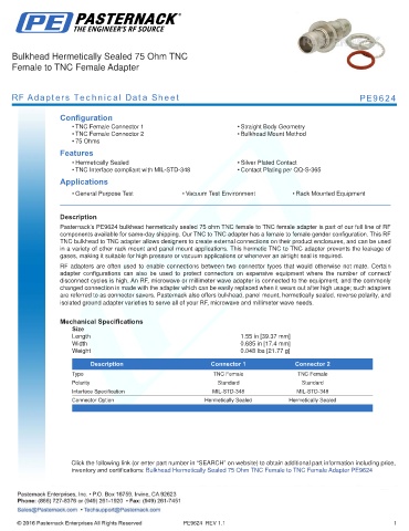 Pasternack’s PE9624 bulkhead hermetically sealed 75 ohm TNC female to TNC female adapter is part of our full line of RF