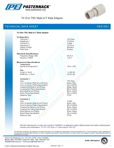 inventory and certifications: 75 Ohm TNC Male to F Male Adapter PE91081