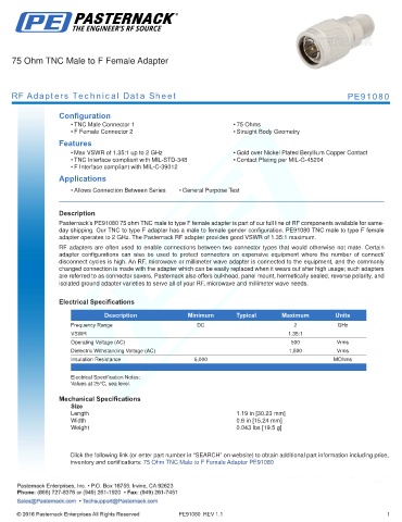 inventory and certifications: 75 Ohm TNC Male to F Female Adapter PE91080