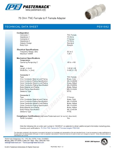 inventory and certifications: 75 Ohm TNC Female to F Female Adapter PE91082
